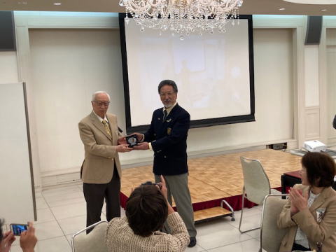 | JAPAN CENTREの児玉会長より名古屋MGカークラブの猪子事務局長にクリスタルの盾が授与されました |